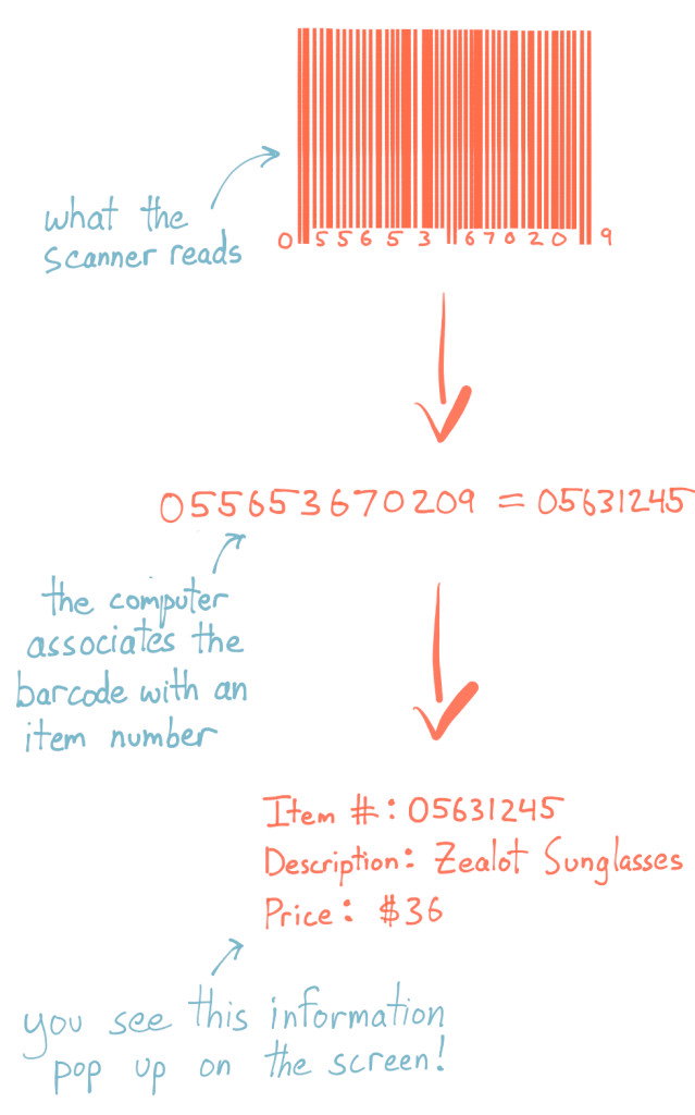 The point-of-sale system can recognize that string of text and will know to bring up certain details — like the name and price of that item — as a result.